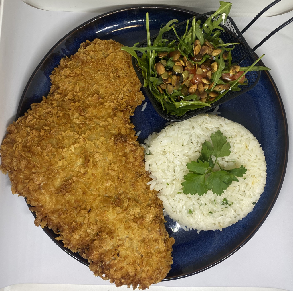 Óriás rántott bécsi sertésszűzből aranyló pankó panírban,petrezselymes jázminrizzsel,mediterrán salátával(Rukkola,apróra vágott paradicsom,fetasajt,