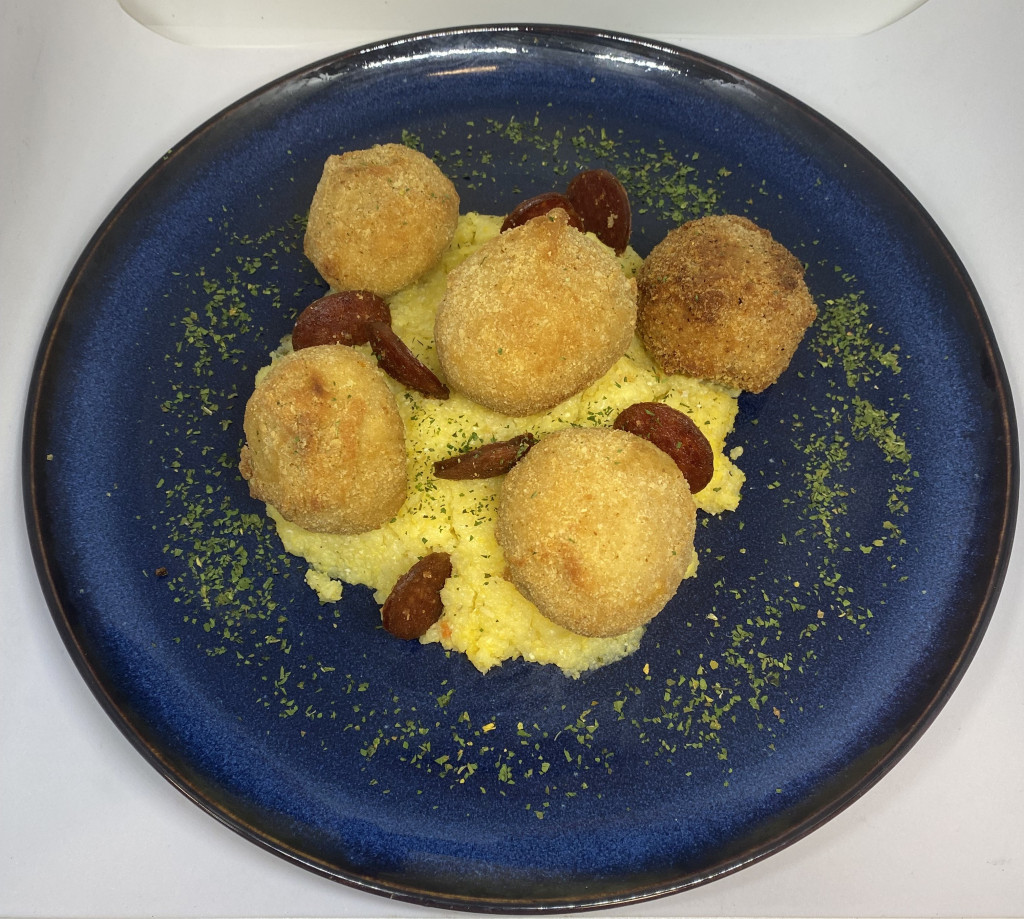 Juhtúróval töltött gomba fejek,polenta,tartármártás,csípős kolbász chips.