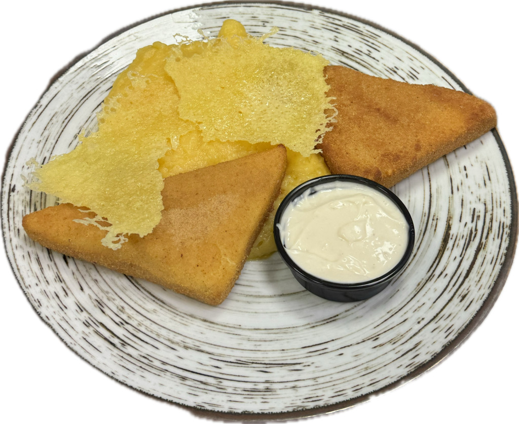 2db rántott trappista, cheddarsajtos burgonyapüré,sajt ropogós,50ml tartármártás.
