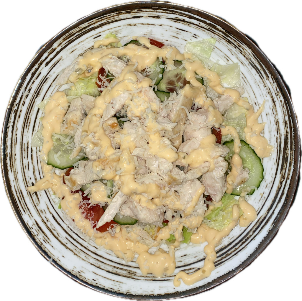 jégsaláta, paradicsom, lila hagyma, uborka, csirkemell, cézár öntet,reszelt parmezán.