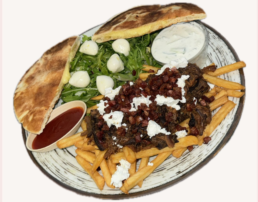 Francia hasábburgonya, 150g tépett pulled beef, vegyes rukkola extraszűz olivaolajjal, mozzarella golyó, tzaziki,