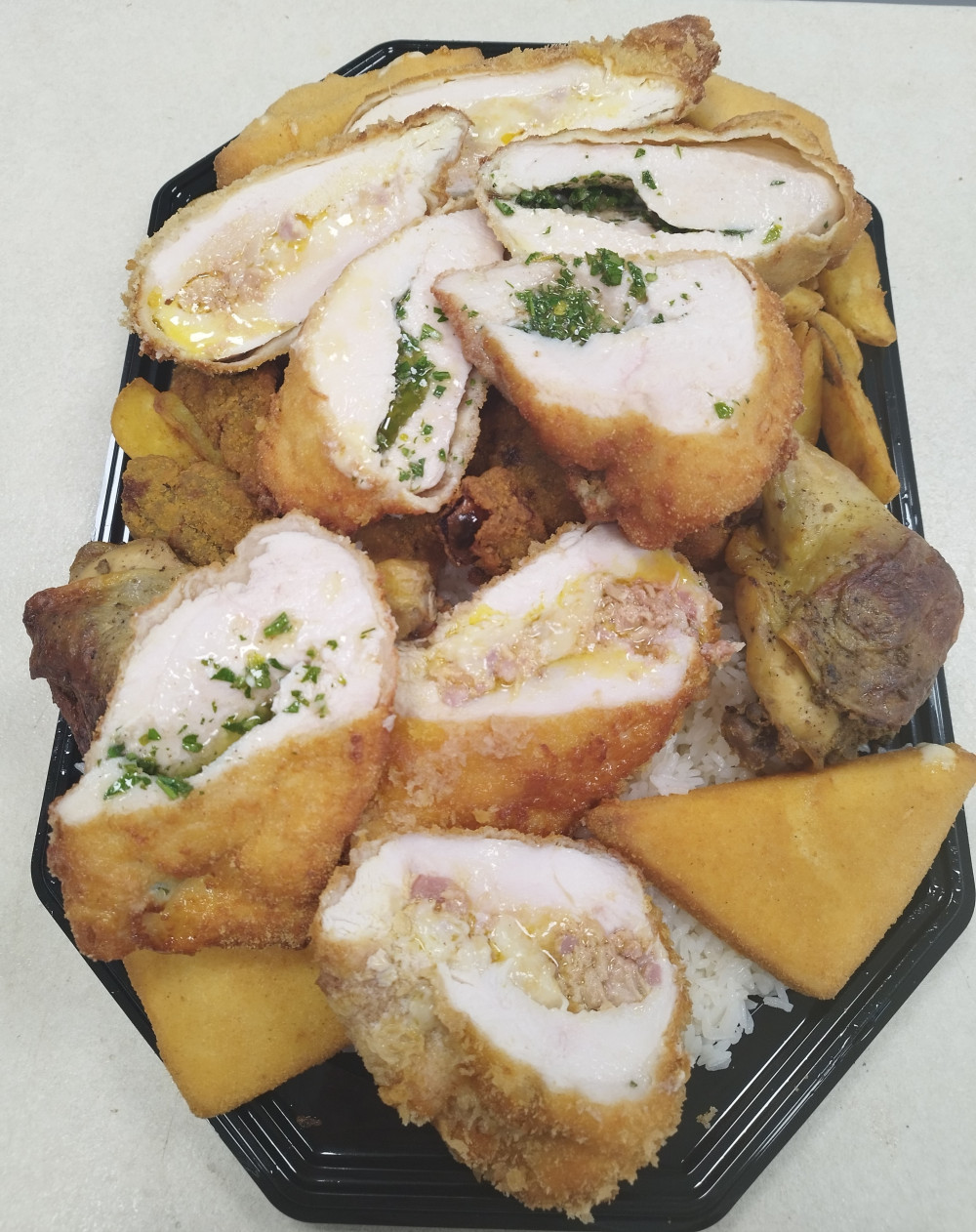1adag rántott camambert falat,2db édeschilis csirkecomb,2db fetasajttal-hámozott paradicsommal töltött csirkemell parmezános