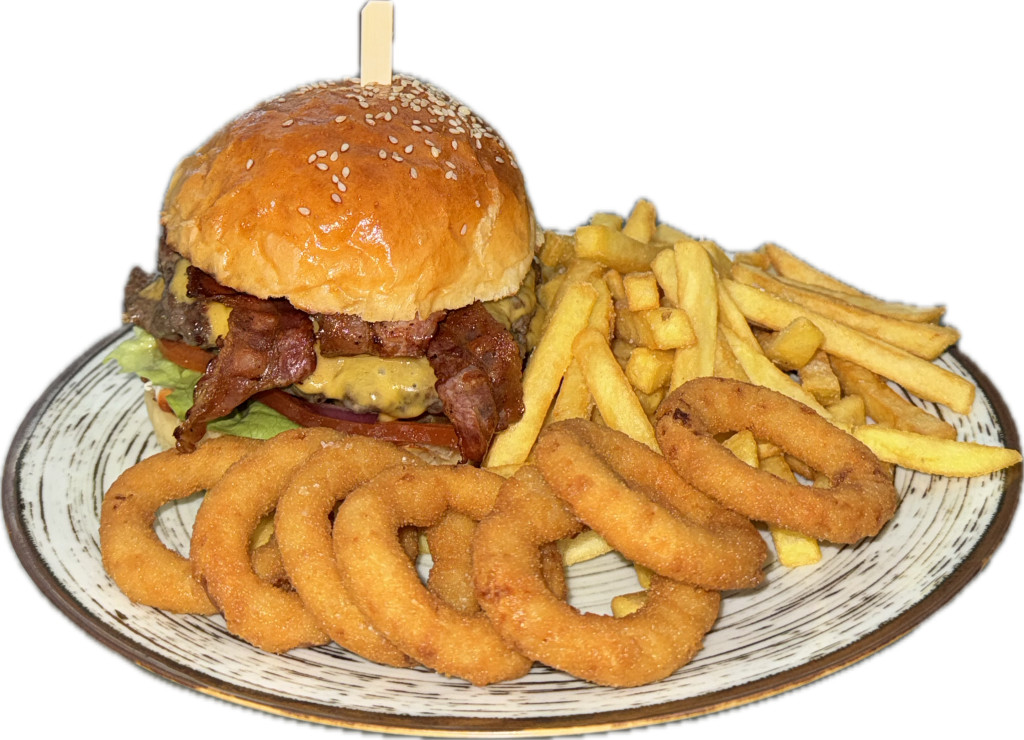 Dupla baconos burger( házi buci, 2db szürkemarha húspogácsa,ketchup, mustár, majonéz, fejes saláta, lilahagyma, paradicsom, csemege uborka, cheddar sajt, bacon),