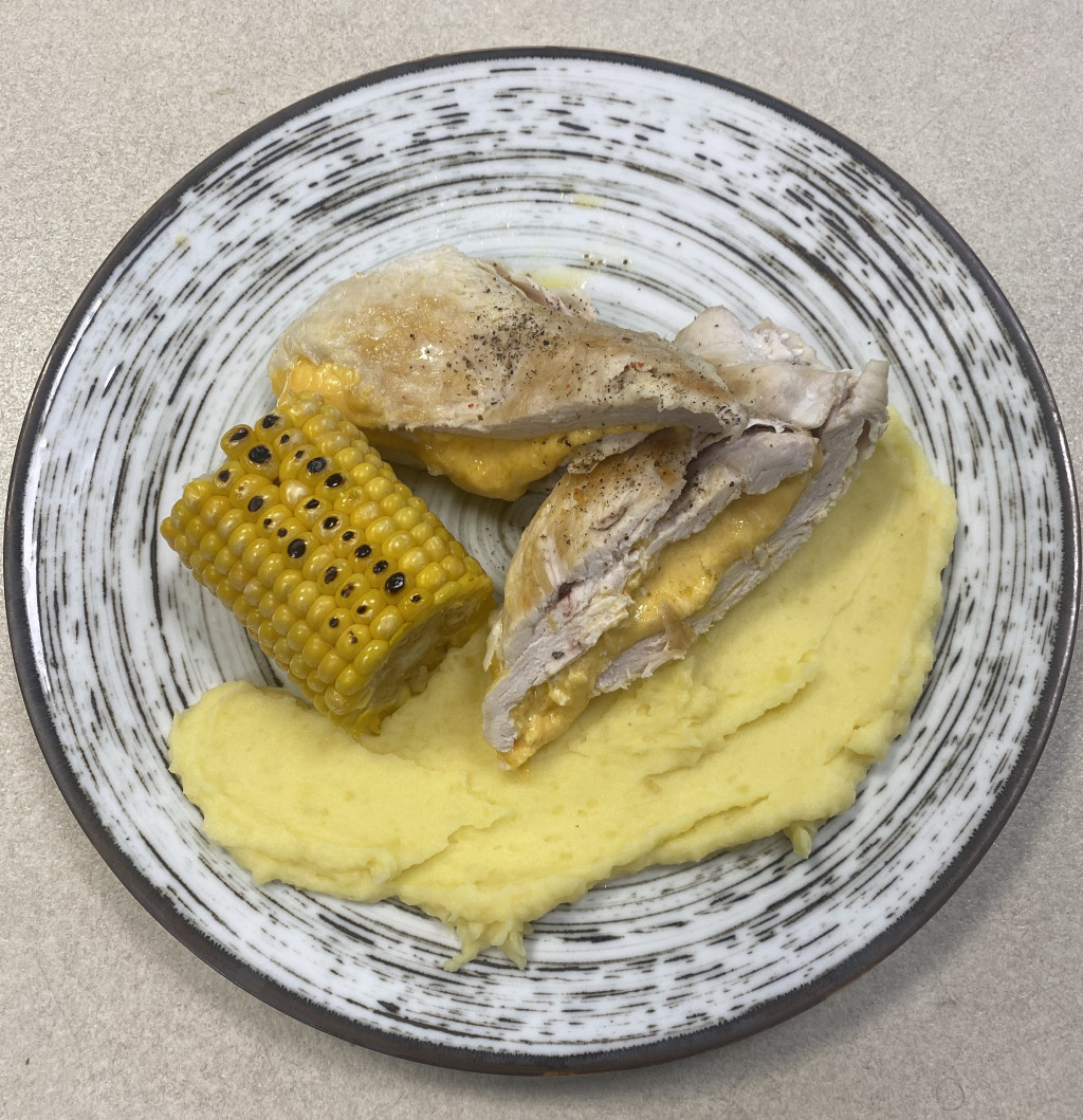 Cheddar sajttal töltött sousvide csirkemell,krémes burgonyapürével,grillezett kukoricával.