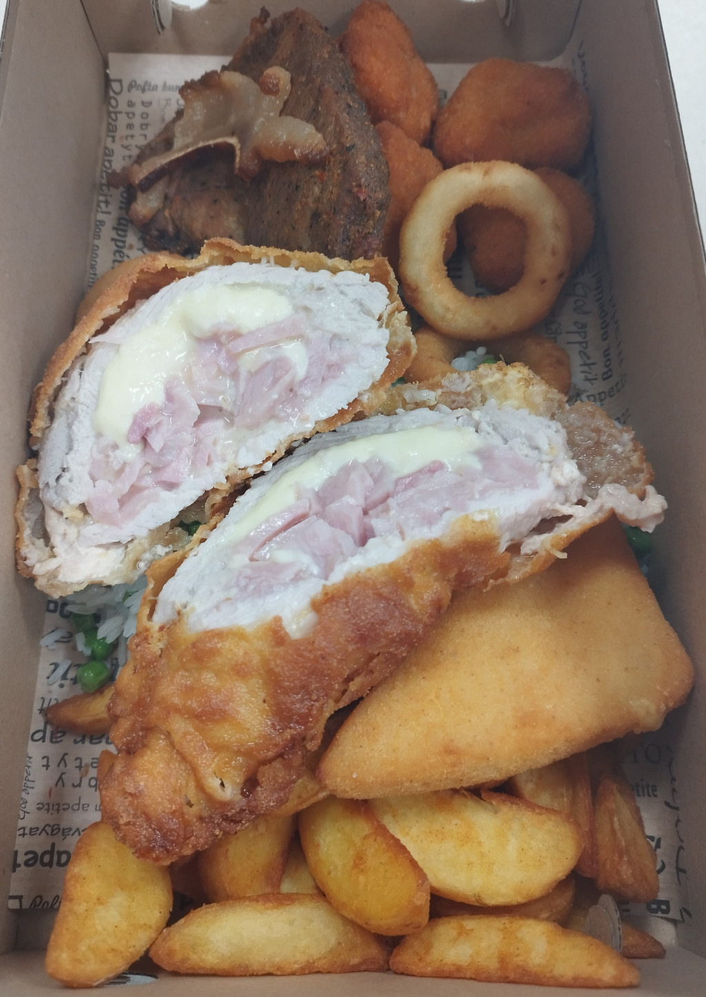 1szelet cigánypecsenye,1db cordonbleu,1db rántott trappista,5db rántott hagymakarika,1db rántott csirkemell pankóban,sült kolbász falatok