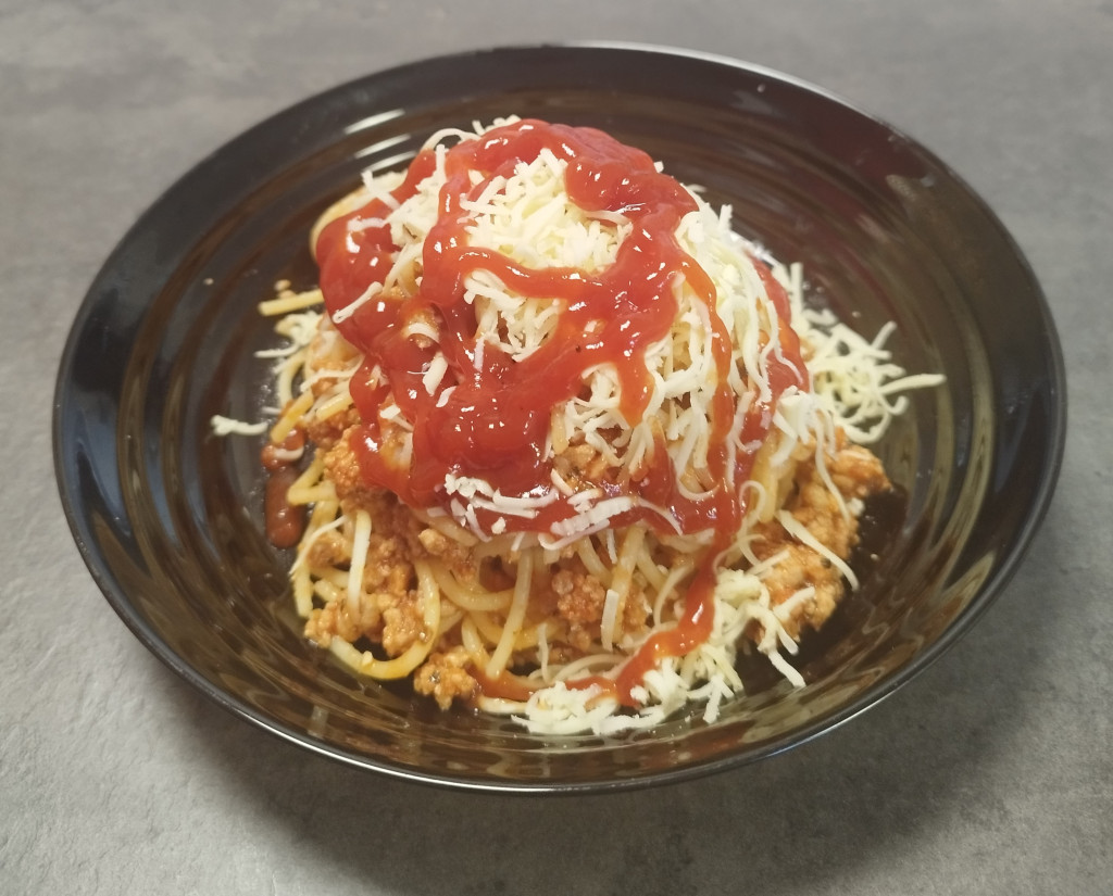 Kis adag bolognai spagetti(durum tésztából),sajttal,ketchuppal.