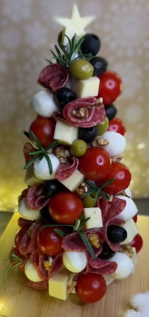 Karácsonyfa alakzatban(kb 40cm magas): olasz szalámik,koktélparadicsom,mozzarella golyók,szines olivabogyók,