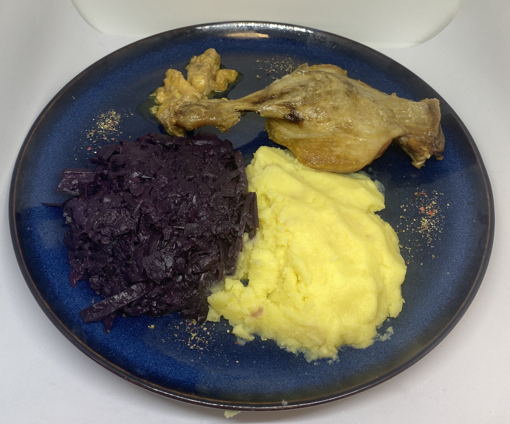 rozmaringos sült kacsacomb,sajtos burgonyapüré sült hízott kacsamáj falatokkal,párolt lilakáposzta aszalt szilvával.