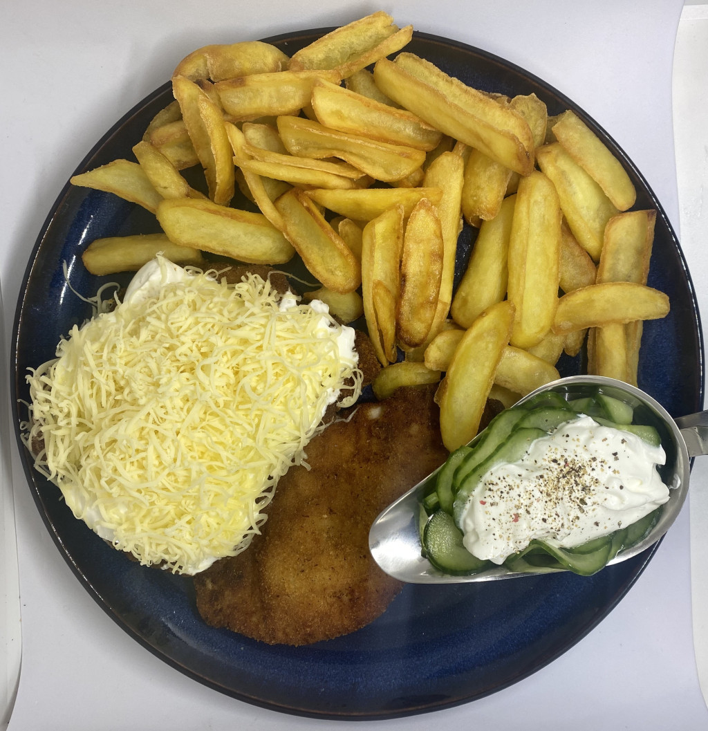 1db bécsi karaj,1db nyitrai szelet(rántott karaj tetején fohagymával,sajttal,tejföllel),mártogatós burgonya,tejfölös ubisali.