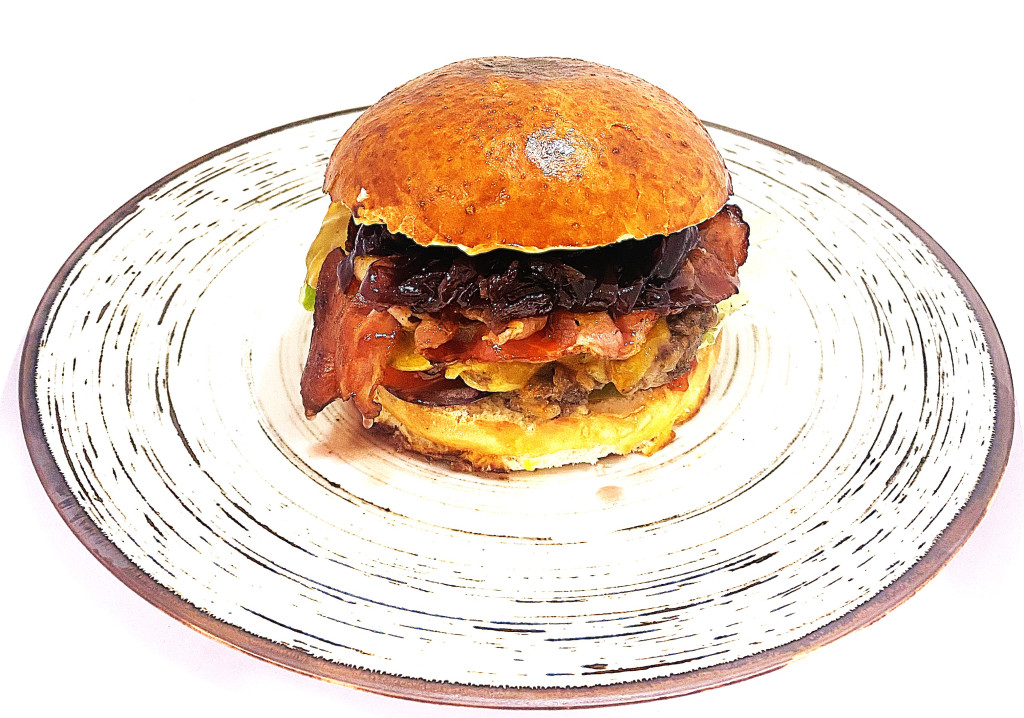 házi buci,zöldségek,hús,lilahagymalekvár,cheddarsajt,ketchup,mustár,majonéz,bbq,pir.hagyma,bacon