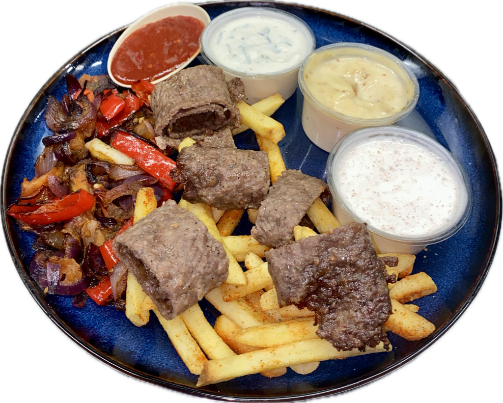 Saját recept alapján készített pácolt marha-sertés kebab,sült zöldségek(paprika,hagyma,paradicsom),fűszeres hasáburgonya,