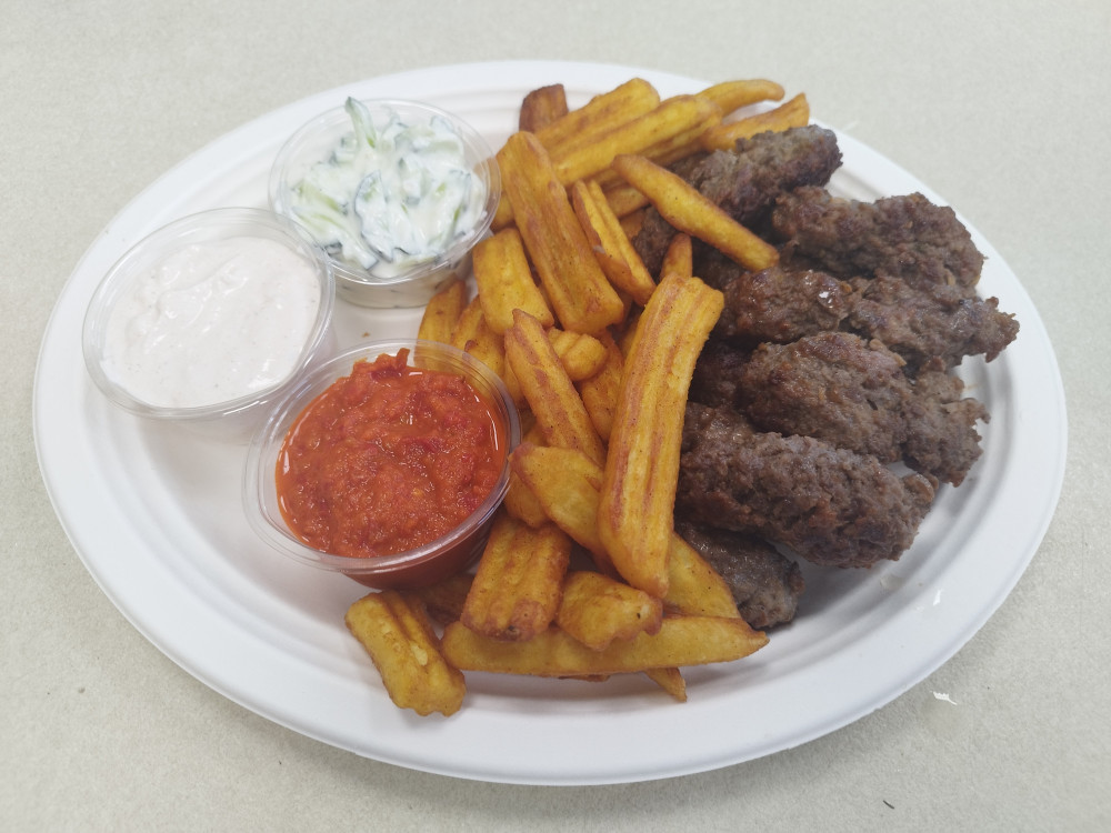 pljeskavica (szürkemarha,sertés) húsból,fűszeres hullámos burgonyával,50ml csípős ajvár,50ml tzaziki,50ml fokhagymás görög joghurt