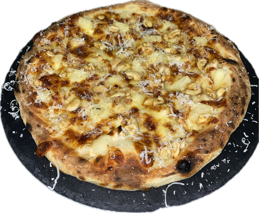 kókusztejes alap,tahinis csirkemell,ananász,mozzarella,parmezán,sós karamellás kesudió