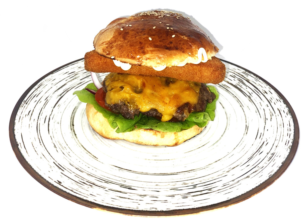 házi buci,szürkemarha hamburgerhús(160g),cheddar sajtszósz,füstöltsajt,rántott trappista,2db vöröscheddar,fejessaláta,provanszi majonéz