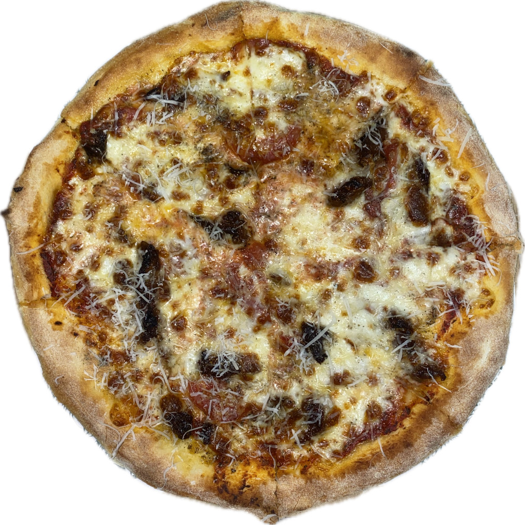 paradicsomszósz,mozzarella, szárított paradicsom,olasz pikáns kolbász, fokhagyma,parmezán, frissen őrölt fekete bors-