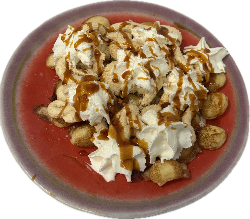 Helyben készített buborék gofri,sós karamellás-kókusz habos feltéttel.