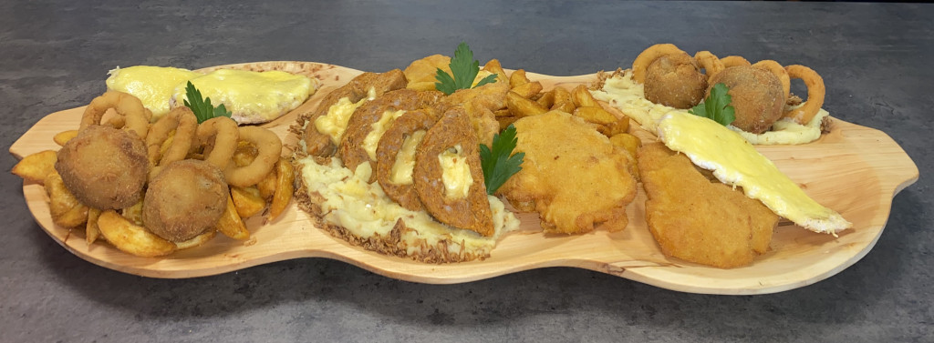 4szelet zöldfűszes sajttal töltött egybesült fasírt,4db juhtúróval töltött gombafej,1adag hagymakarika,