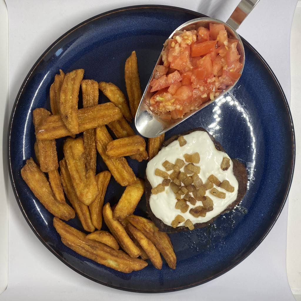 fokhagymás tarjasteak rásült tejföllel szalonnakockákkal,apró kockára vágott fokhagymás paradicsomsalátával,fűszeres hullámos burgonyával
