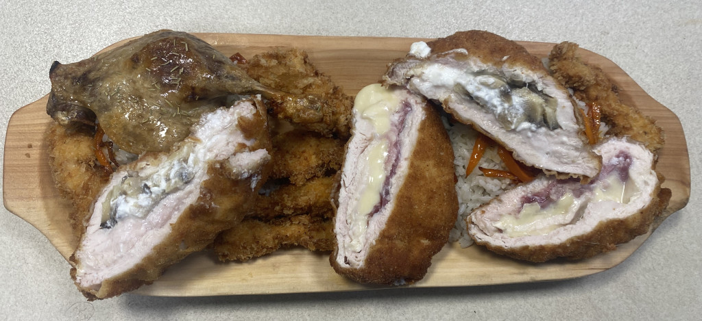 2db mézes-mázas csirkecomb,2db zöldfűszeres sajtkrémmel-gombával-sajttal töltött csirkemell,