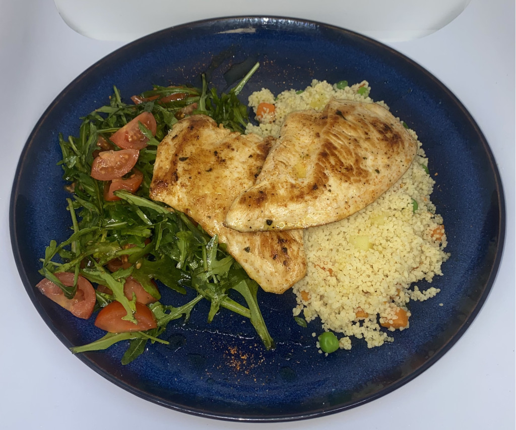 fűszerezett roston csirkemell,zöldséges kusz-kusz,rukkola saláta extraszűz