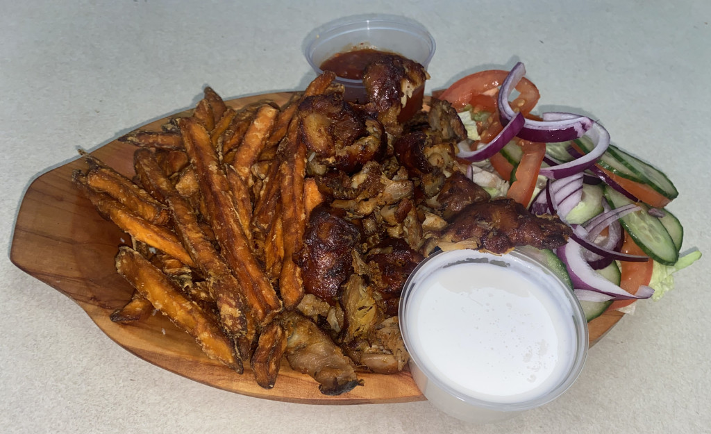 édesburgonya hasáb,gyroshús,jégsaláta,kígyóuborka,paradicsom,chilis-lime-os görög joghurt,parmezán rogogós