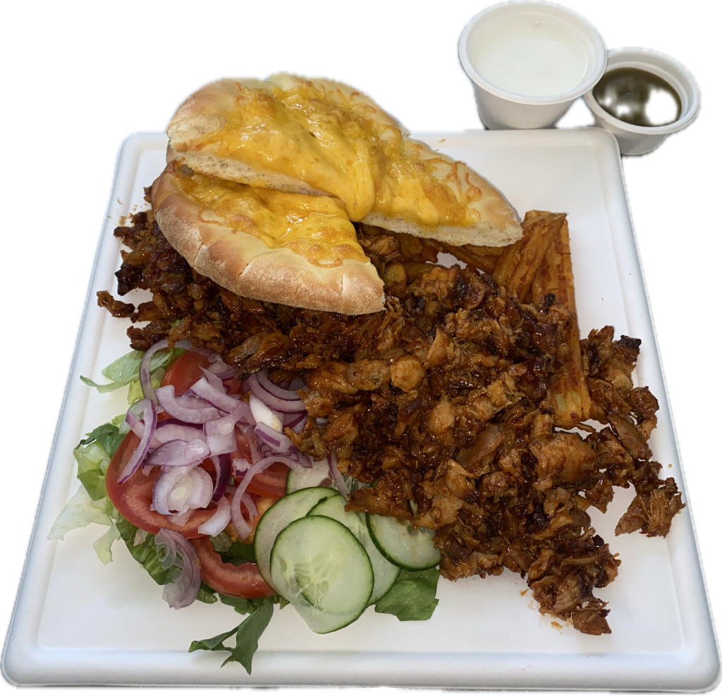nagy adag chilis bbq-val forgatott gyroshús,pirított hagyma,80ml joghurt öntet,30ml sriracha chili szósz kenderrel (chili61%)